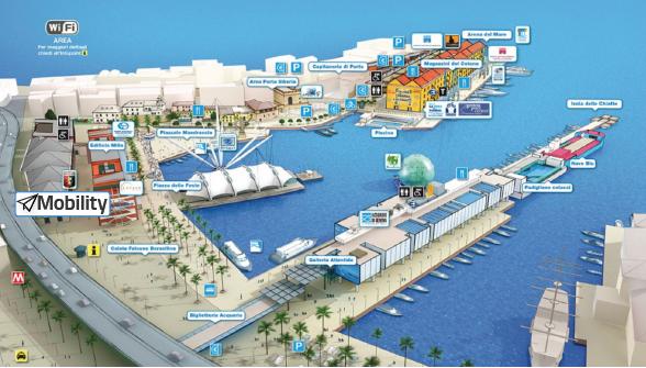 Porto Antico ha previsto l’inserimento del Mobility Center al servizio dell’intera area che comprende zone espositive commerciali, ristorazione, la Piazza delle Feste, l’Acquario, i Magazzini del Cotone, fino al Galata Museo del Mare.